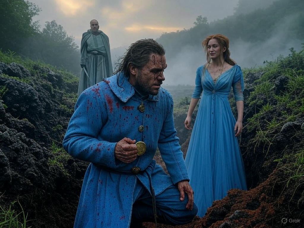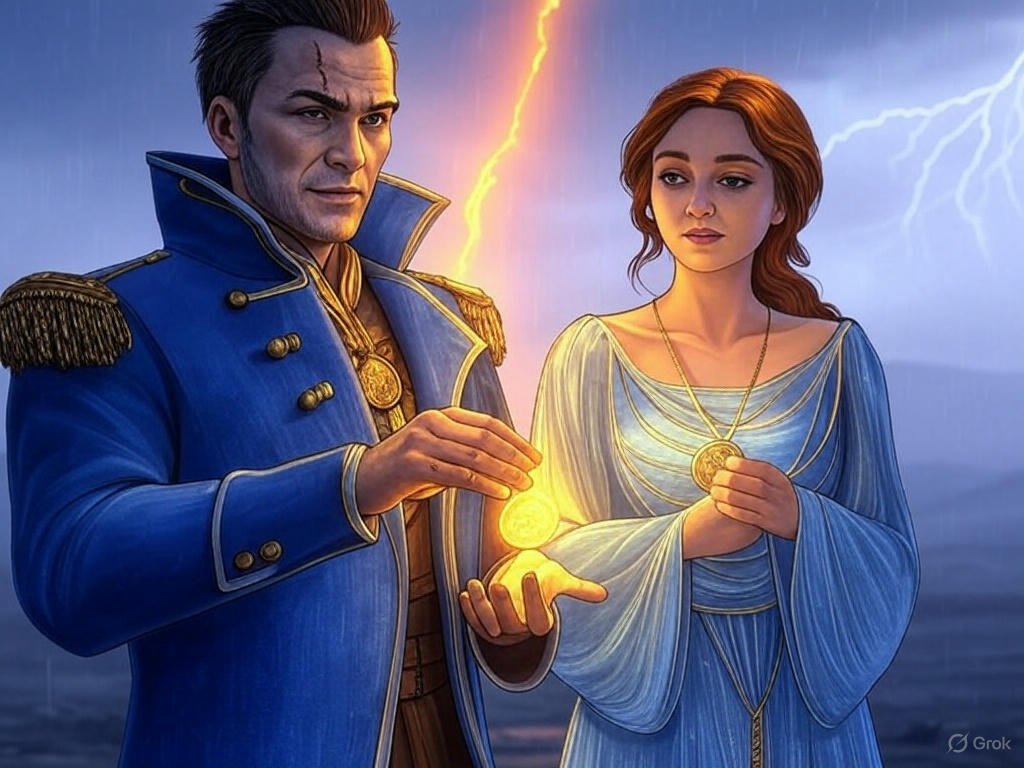 Fiona turned—gown heavy—threads dimming—her gaze locked with his—steady—searching—rain traced her jaw—her lips parted—then curved. “Something’s alive,” she said—voice firm—chestnut hair swaying—gold threads coiled loose—shimmering with quiet joy. Tobal nodded—scar ached—medallion warm—blue coat clung—rain stopped—haze hung thick. “We’re alive,” he said—gruff—soft.