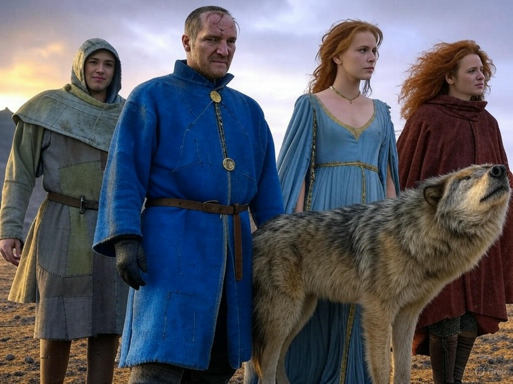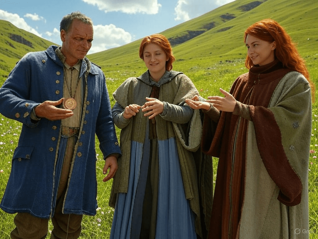 [Image: A sunlit valley cradled by rolling hills, golden rays spilling over lush grass and scattered wildflowers under a sky of deepening blue. Tobal’s scarred face shines with quiet strength under a worn blue militia coat, medallion glowing gold in his steady grip. Fiona’s sky blue gown sways on her lean frame, chestnut hair loose and catching the sun, golden threads pulsing bold. Rafe’s wiry frame leans easy in a patched cloak of faded green and gray, grin warm. Becca’s red hair blazes under a cloak of deep brown and russet, eyes fierce with light. Valentine’s shaggy gray-brown fur ripples as he romps through the grass—vivid, warm, with the hum of life stirring the air]
