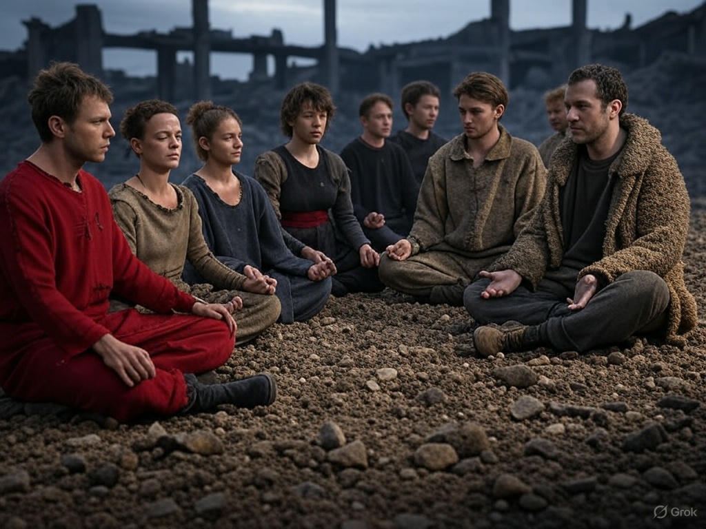 The circle glowed—rubble stilled—war’s clash hissed cold—wild’s hum weakened, but Xenon’s cry surged, threading through—the crew sat firm with Lumens in the warworn hub, meditating on love and peace, duality as the loving embrace of opposites weaving fierce against the pulse of Xenon’s strife.