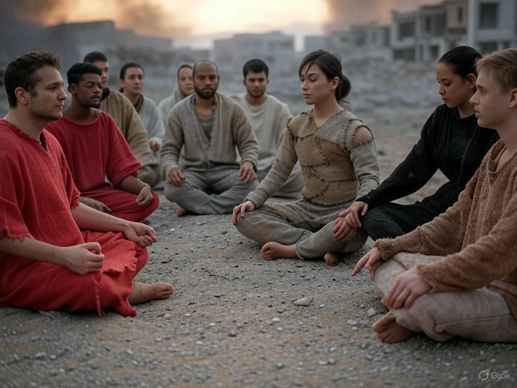 The circle glowed—rubble stilled—war’s clash hissed cold—wild’s hum weakened, but Xenon’s cry surged, threading through—the crew sat firm with Lumens in the warworn hub, meditating on love and peace, duality as the loving embrace of opposites weaving fierce against the pulse of Xenon’s strife.