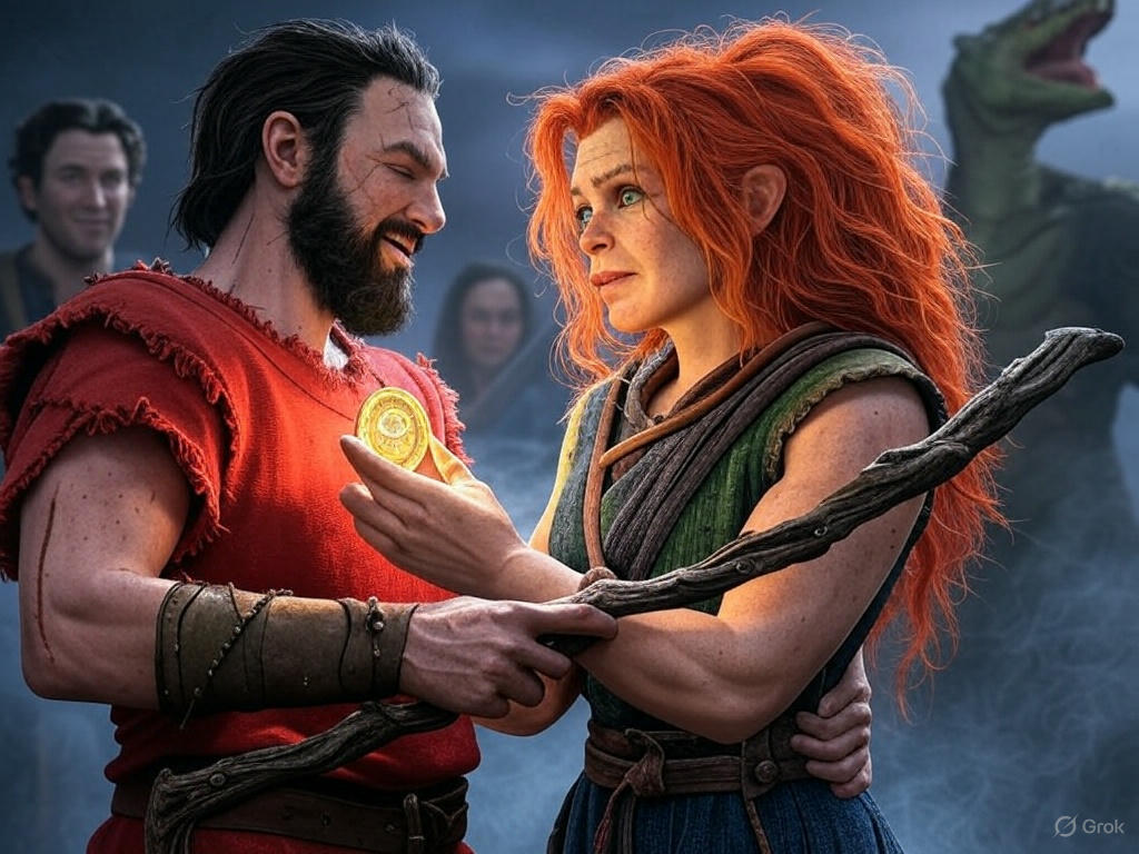 Dusk draped over Neon, a silver mist threading a rustic sky—glow worms twinkled overhead, their hum weaving soft as the wooden platform groaned beneath the Knights’ boots, earth thrumming like a living root. A damp breeze rustled through, moss and dew rising pungent from below—sentient vines pulsed faint across the hub, threading dim light through weathered shacks, their thatch creaking low under strain. Tobal leapt from the rift’s shimmer, his tunic—red, frayed—flapping loose, wild hair tangling in the wind—scars ached, medallion glowing, gold humming bold against his chest, yang’s awareness threading his grip as he squinted at the glowing vines—Fiona’s warmth brushed close, a spiced spark threading his pulse. Fiona landed beside him, her tunic—rough, stitched—swirling free, red hair whipping wild, green eyes glinting keen—her staff swung light, wood gnarled, yin’s wild pulsing through her veins, vines swaying loose toward the earth—her fingers grazed his wrist, a tender heat flaring bold.
