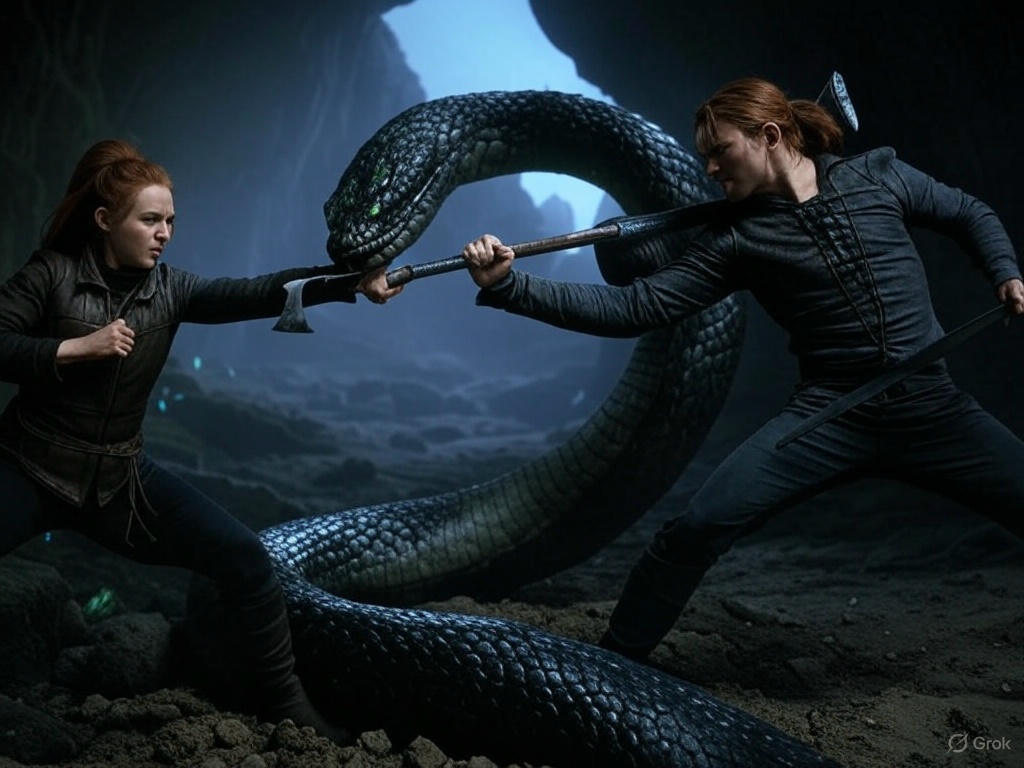 OAKenspire’s glow pulsed through the cave, the serpent’s hiss growing louder, the ground trembling as loose rocks began to fall from the ceiling, the cave’s structure groaning under the strain. Kael’s voice rumbled: “Now’s real—strike now!” Becca’s voice snapped back, steady and sure: “Present binds—dodge with me!” Her axe swung, the wild flaring as his blade met scales, his breath growling: “Wild’s ours—damn it!” Becca’s eyes flared, her voice weaving through the chaos: “OAK stands—us here.” The wild pulsed stronger, OAKenspire’s gloom flaring with a shadowed intensity, the serpent lunging as rocks crashed around them, the wild churning, the OAK surging with a fierce energy—danger pulsed through their shared stand.