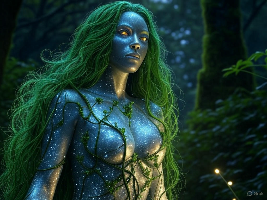 The shimmer parted—Lumens emerged, a female Gaia spirit with silver luminescent skin, flowing green hair like vines, eyes glowing with the warmth of earth’s core—shimmering wisps of light danced around her, her voice threading soft as Neon’s strength pulsed through her. Fiona’s vines reached—“She’s wild—snare’s core’s near”—her green eyes flared, a spiced warmth threading her lean as she pressed into Tobal—“We’ve got help”—her hand lingered on his, wild weaving fierce in Neon’s rustic hub.