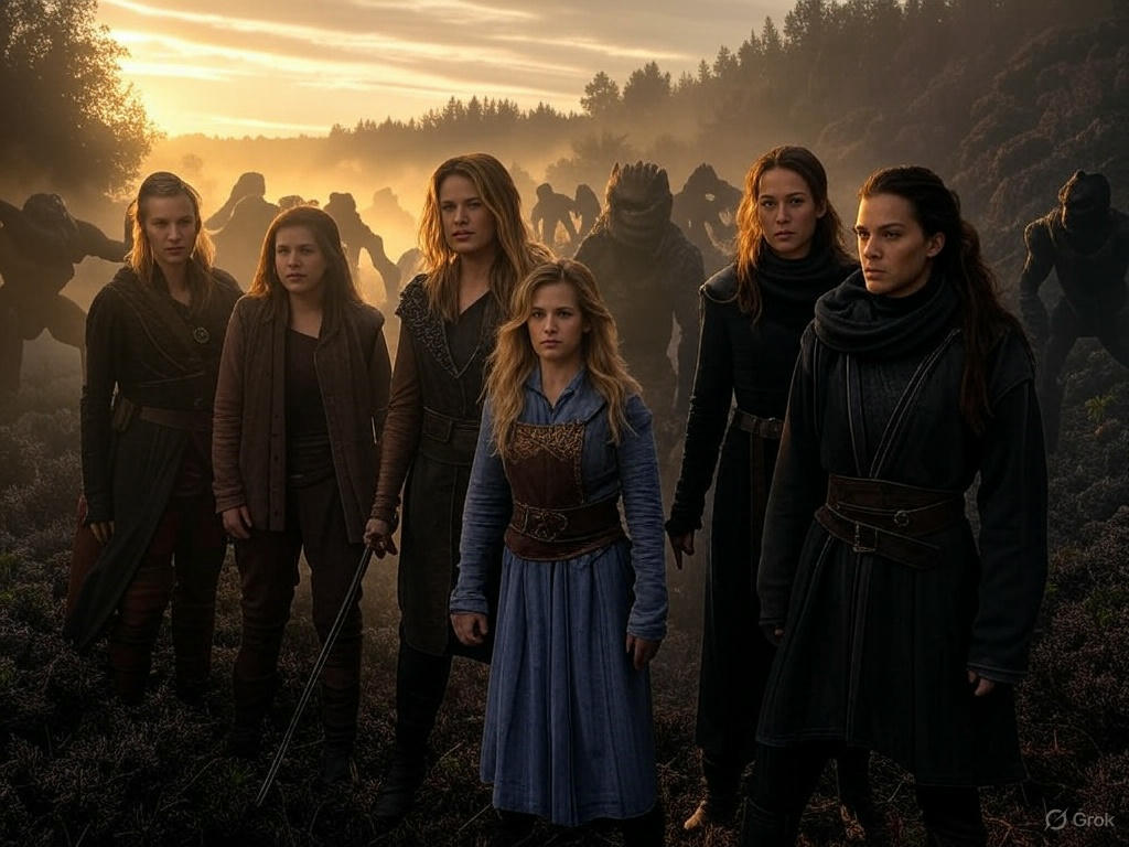 A reptilian hum buzzed low—a drone circled beyond the cliffs, its cold tendrils threading jagged claws through Argon’s wild—Federation shadows loomed, hunting Howling Wolf and Adam Gardner, OAK school guardians hiding in the cave where Tobal’s parents were slain. Lumens glided through the mist, her silver luminescent skin glowing soft in a black dress, green hair flowing like vines, eyes flaring with earth’s core—shimmering wisps pulsed, threading toward the cave’s glow. Becca waded through the shallows, her tunic—dark, torn—stretched taut over broad shoulders, shaved head gleaming—blue eyes flared fierce, axe sharp in her grip, yin’s wild snarling low as she slashed a stray tendril—her breath steamed hot. Rafe darted along the shore, his tunic—coarse, patched—flapping damp, hazel eyes glinting mischief—his knife spun, steel flashing, yang’s playful spark threading his wiry frame as he nicked a vine—a grin flashed sly. Cal stepped steady through the mist, his tunic—soft, faded—hanging loose, tangled brown hair brushing his brow—gray eyes steadied calm, spear light in his grip, yang’s quiet strength pulsing steady as he scanned the falls—his stance rooted firm. Valentine loped beside, his coat—thick, matted—bristling wet, yellow eyes glinting sharp—claws scraped stone, yang’s instinct rumbling low through his shaggy stride, ears twitching at the drone’s hum.