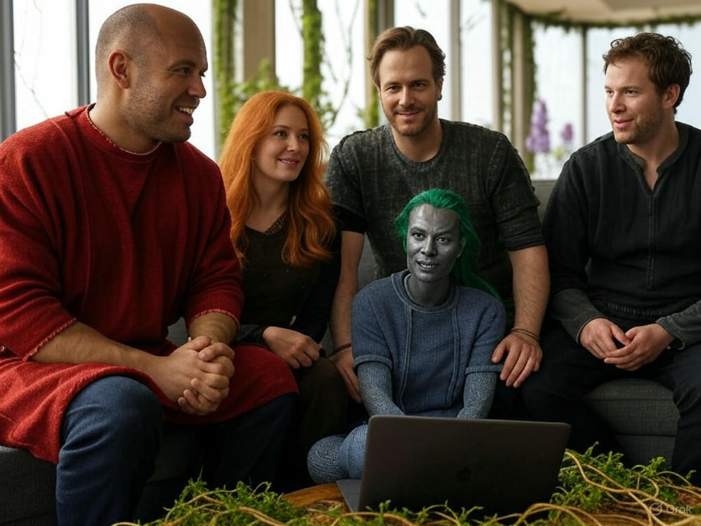 A low hum buzzed through—Krypton’s cry, raw and urgent, threading through the wild—“Minds fade—wild dies”—a sharp hiss followed, reptilian and cold, threading through the airwaves, fake news blaring from screens controlled by the Federation and their reptilian masters. Lumens glided in, her silver luminescent skin glowing soft in a black dress, green hair flowing like vines, eyes flaring with earth’s core—shimmering wisps pulsed, threading toward the screens. Becca stomped through the door, her tunic—dark, torn—stretched taut over broad shoulders, shaved head catching the neon glow—blue eyes flared fierce, axe sharp in her grip, yin’s wild snarling low as she eyed the flickering lies—her breath steamed hot. Rafe darted to a counter, his tunic—coarse, patched—flapping loose, hazel eyes glinting mischief—his knife spun, steel flashing, yang’s playful spark threading his wiry frame as he nicked a cable—a grin flashed sly. Cal stepped steady into the room, his tunic—soft, faded—hanging loose, tangled brown hair brushing his brow—gray eyes steadied calm, spear light in his grip, yang’s quiet strength pulsing steady as he traced the hum—his stance rooted firm. Valentine bounded in, his coat—thick, matted—bristling faint, yellow eyes glinting sharp—claws scraped concrete, yang’s instinct rumbling low through his shaggy stride, nose flaring at the reptilian stench.