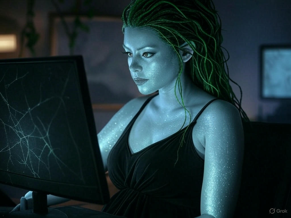 A reptilian drone buzzed low—fake news pulsed through screens, cold tendrils threading lies to enslave Krypton’s minds—Federation minions loomed, their core signal pulsing nearby. Lumens stood by a cracked screen, her silver luminescent skin glowing soft in a black dress, green hair flowing like vines, eyes flaring with earth’s core—shimmering wisps pulsed toward the signal’s source. Jazz perched at a desk, wiry frame tense, buzzcut catching the neon glow, patched jacket rustling—her fingers danced over a keyboard—“Core’s close—tech’s heart.” Milo flanked her, broad shoulders steady, scarred lip twitching, ink-stained hands sketching on a tablet—his rumble steadied—“Lies pulse—find it.” Becca paced the room’s edge, her tunic—dark, torn—stretched taut over broad shoulders, shaved head gleaming—blue eyes flared fierce, axe sharp in her grip, yin’s wild snarling low as she eyed the screens—her breath steamed hot. Rafe darted to a shelf, his tunic—coarse, patched—flapping loose, hazel eyes glinting mischief—his knife spun, steel flashing, yang’s playful spark threading his wiry frame as he nicked a wire—a grin flashed sly. Cal stood steady near a flickering lamp, his tunic—soft, faded—hanging loose, tangled brown hair brushing his brow—gray eyes steadied calm, spear light in his grip, yang’s quiet strength pulsing steady as he scrolled a feed—his stance rooted firm. Valentine prowled the room’s rim, his coat—thick, matted—bristling faint, yellow eyes glinting sharp—claws scraped linoleum, yang’s instinct rumbling low through his shaggy stride, nose flaring at the drone’s hum.