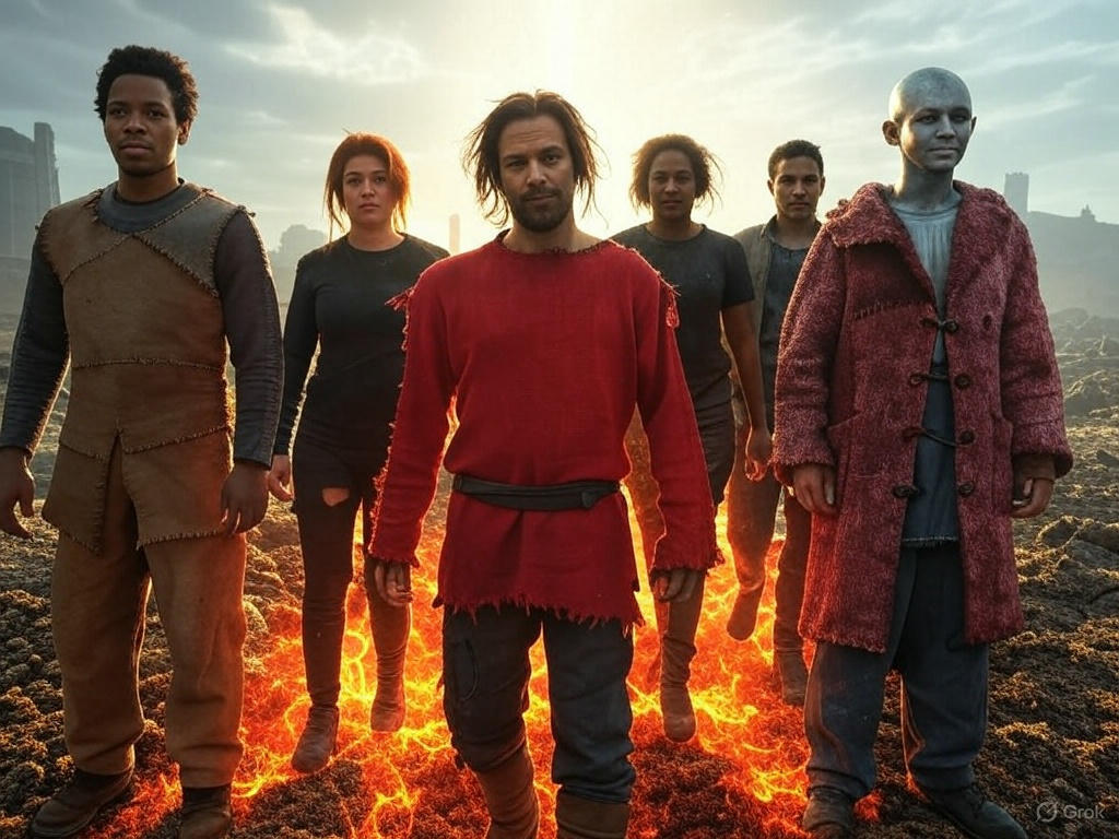 The war was dust—Xenon’s wild surged triumphant—Kael stood steady, wiry frame firm, scarred face softened, tattered cloak swaying—his voice rang clear—“Wild’s ours—we’ll rift too.” Mara flanked him, lean and calm, matted hair framing her face, cracked staff pulsing faint—her purr steadied—“Love holds—we follow.” Lila darted beside, slight and quick, patched hood framing her hope—her hum pulsed—“Peace thrives—we go”—together, they joined, allies bound by Xenon’s healing. Lumens stood radiant, her silver luminescent skin glowing fierce in a black dress, green hair flowing like vines, eyes flaring with earth’s core—shimmering wisps flared—“Xenon thrives—we all rift.” Becca stood with Kael, her tunic—dark, torn—stretched taut over broad shoulders, shaved head gleaming—blue eyes flared bright, axe propped beside her, yin’s wild humming low as she grinned—her breath flared warm. Rafe danced near Mara, his tunic—coarse, patched—flapping loose, hazel eyes glinting mischief—his knife spun wild, steel flashing, yang’s playful spark threading his wiry frame as he juggled a stone—a grin flashed sly. Cal stood tall with Lila, his tunic—soft, faded—hanging easy, tangled brown hair brushing his brow—gray eyes steadied calm, spear light in his grip, yang’s quiet strength pulsing steady as he nodded farewell—his stance relaxed firm. Valentine sat near, his coat—thick, matted—bristling soft, yellow eyes glinting sharp—claws tapped rubble, yang’s instinct rumbling low through his shaggy stride, a soft bark threading his calm.