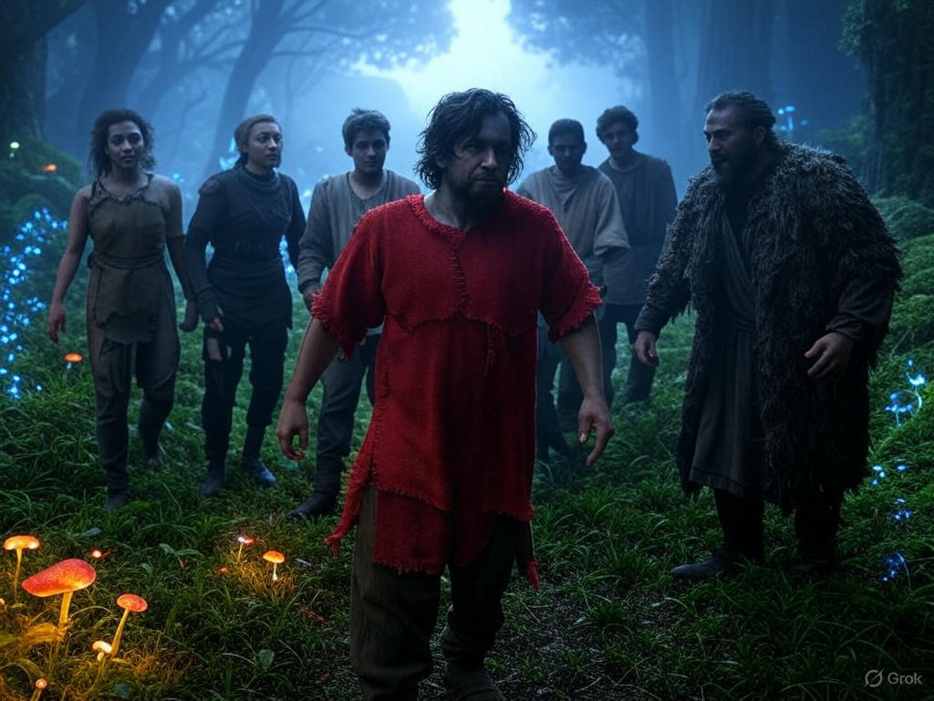 A low hum pulsed through—Radon’s cry, raw and urgent, threading through the wild—“Dark consumes—wild fades”—a sharp hiss followed, reptilian and demonic, threading through the forests as dark forces loomed. Lumens glided in, her silver luminescent skin glowing soft in a black dress, green hair flowing like vines, eyes flaring with earth’s core—shimmering wisps pulsed, threading toward the lush wild. Kael stomped beside Becca, wiry frame tense, scarred face set, tattered cloak swaying—his blade gleamed—“Evil stirs.” Becca matched him, her tunic—dark, torn—stretched taut over broad shoulders, shaved head catching the fairy glow—blue eyes flared fierce, axe sharp in her grip, yin’s wild snarling low—her breath steamed hot. Rafe darted near Mara, his tunic—coarse, patched—flapping loose, hazel eyes glinting mischief—his knife spun, steel flashing, yang’s playful spark threading his wiry frame as he nicked a vine—a grin flashed sly. Mara, lean and steady, cracked staff pulsing, stepped with him—“Magic calls.” Cal stood tall with Lila, his tunic—soft, faded—hanging loose, tangled brown hair brushing his brow—gray eyes steadied calm, spear light in his grip, yang’s quiet strength pulsing steady—his stance rooted firm. Lila, slight and quick, patched hood framing her face, darted beside—“Wild sings.” Valentine bounded in, his coat—thick, matted—bristling soft, yellow eyes glinting sharp—claws tapped moss, yang’s instinct rumbling low through his shaggy stride, nose flaring at the dark stench.