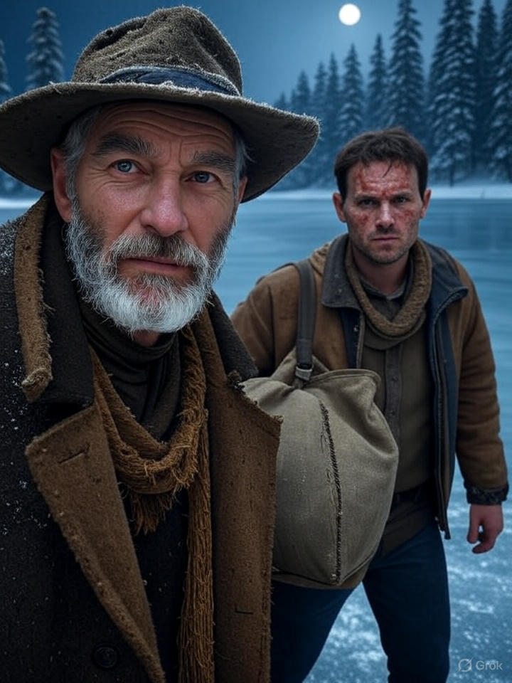 Hours later, he stood at the lake’s edge, its icy surface gleaming under a weak sun, sundogs flickering on either side. Exhaustion weighed him down, the scars itching faintly, his resolve faltering. Then he saw him—an old man, stooped and weathered, fishing through a hole in the ice. His gray beard caught the light, eyes sharp beneath a tattered hat, a presence that felt ancient yet alive. Tobal approached, wary. “Who are you?” he asked, voice rough.