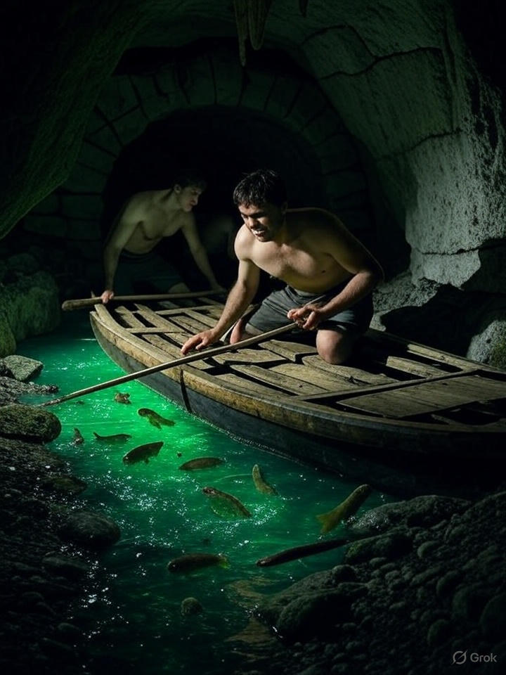 He kneels on the raft, eyes searching for the finest, largest stalactite, reaching out, but the planks slip from under him. He stumbles, grasps for support, and plunges thrashing into the water. A spray shoots up, falls back, dousing both lamps. Reichenbach clings to his rocking raft, seeing a struggling body in glassy green, wild, frantic, aimless movements stirring air bubbles. This isn’t the steady confidence of a swimmer at ease in water—it’s a desperate fight against death. A moment’s hesitation, then he tears the rope from his waist, ties a loop, and as the sinking man’s flailing brings him briefly to the surface, throws the line over his head and arms.