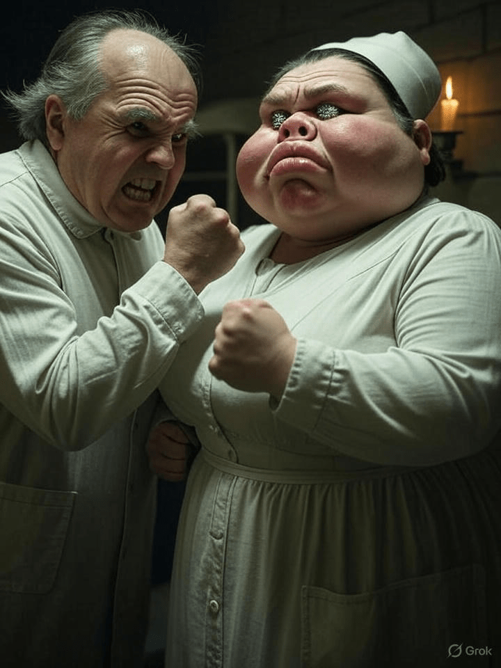 The nurse is a stout woman with a broad face where prominent cheekbones, swollen lips, and small, glittering pig-like eyes combine into an uninviting overall impression. One can imagine she handles her patients roughly and doesn’t fuss over them. She darts a sidelong glance at Reinhold and, drawing courage from the presence of a witness, tries to assert herself.