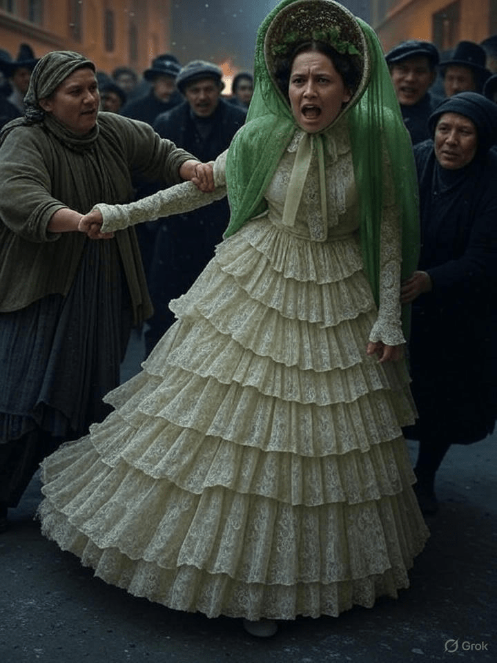 No, they’re not entirely among themselves. A worker woman, who has taken on the role of cook for a group and is searching for wood for the fire, discovers a woman in the shadow of one of the tax office gate’s pillars, standing completely still as if she doesn’t want to be noticed. She’s a woman in a light, layered lace dress with a green silk mantilla and a bonnet adorned with green foliage. A lady, then—and does a lady belong here? The worker woman finds this immediately suspicious; what’s a lady in a green silk mantilla and bonnet doing now at Mariahilferlinie, where the working people are asserting themselves in the name of freedom? She grabs the stranger’s arm with a rough grip, drags her into the fire’s light circle, plants herself in front of her, and plants her hands on her hips: “What’s this fine lady looking for here with us? Does she think this is a theater?”