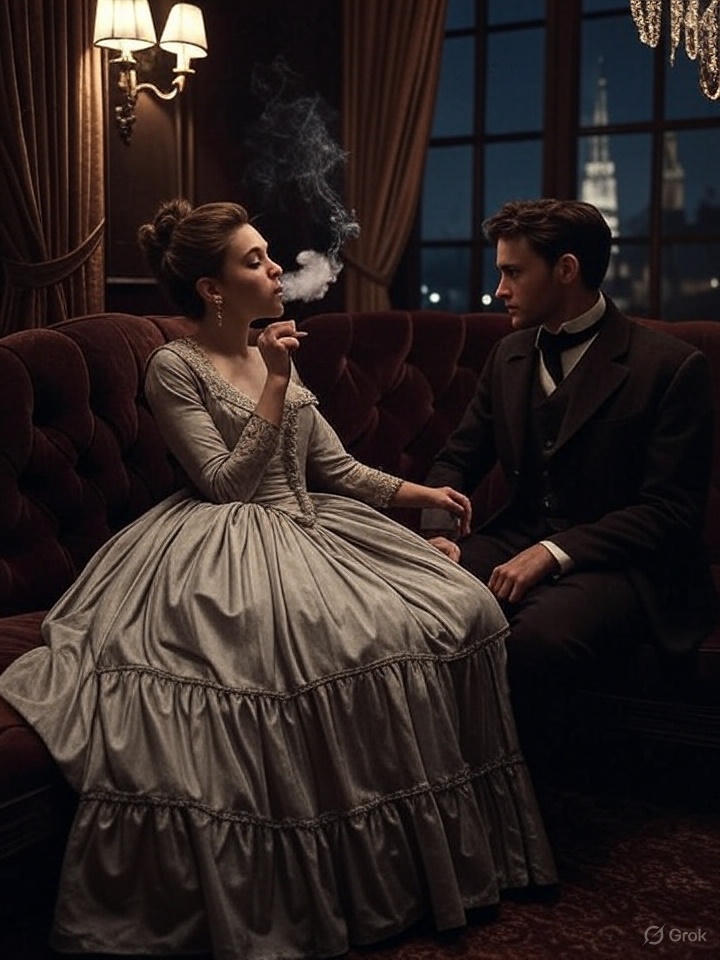 She lay half-reclined on the sofa, blowing rings of cigarette smoke into the air.