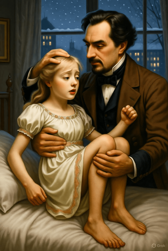 He lifts her and carries her to the bed; spasms ripple across her body, her hands clench into fists then relax, her legs stiffen, and her mouth trembles with pain. Yet amid all this, the girl’s face holds a delicate, touching beauty—touching especially for that mysteriously familiar quality Reichenbach can’t name. Reichenbach is deeply dissatisfied with himself for blurting it out so harshly; he feels as if he’s trampled young crops with waders. There lies the girl, looking at him like her executioner yet with such submission, as if he couldn’t possibly hurt her.