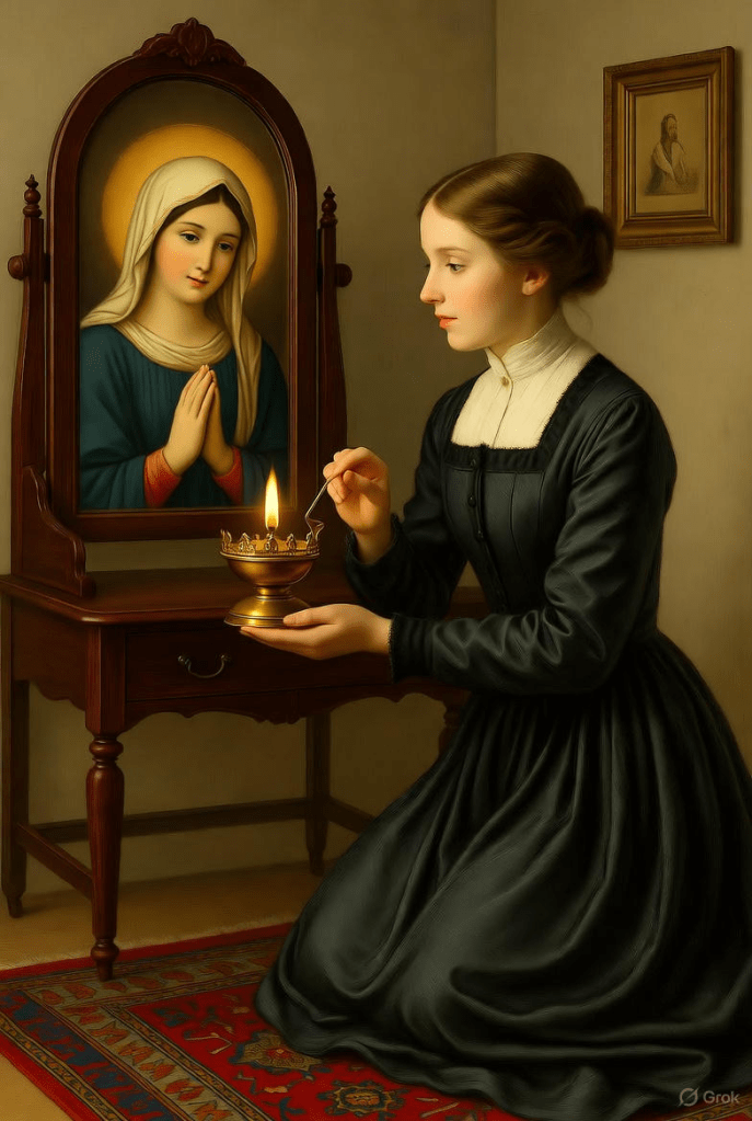 She went up to her room and lit the oil lamp before the image of Mary; then she knelt and threw herself on the floor before the gentle, smiling face of the miraculous Virgin.