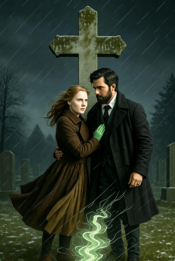 They stand by the stone cross in the center of the cemetery, surrounded by graves in the darkness of the stormy night. Friederike can’t help but cling to Reichenbach, and he places his arm around her shoulders.