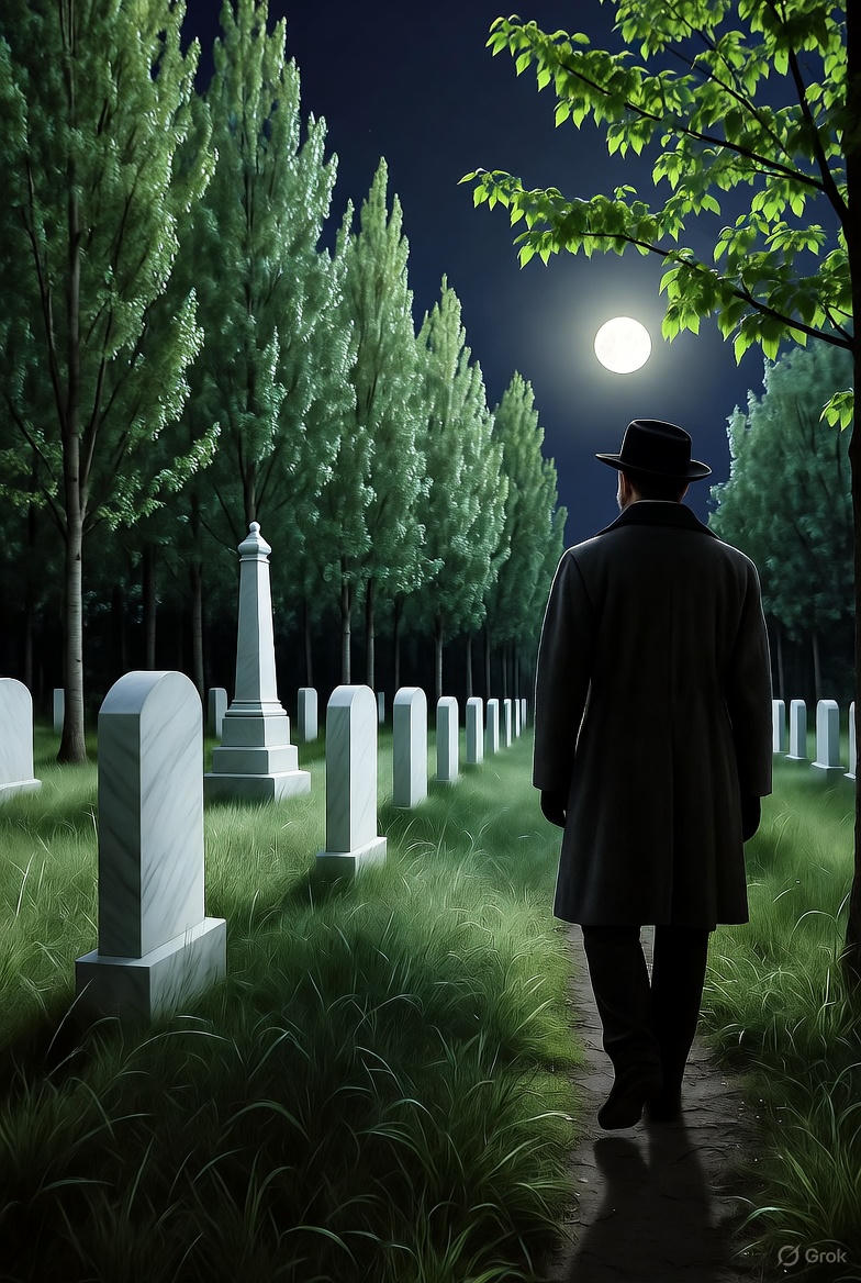In the cemetery, the leaves of the silver poplars rustled with their eerie solemnity. White marble tombstones stood out from the darkness like ghosts. It was so terribly solemn, this eerie rustling of the trees. There was a sound that reminded him of the rattling of skeletons. He felt very uneasy.
