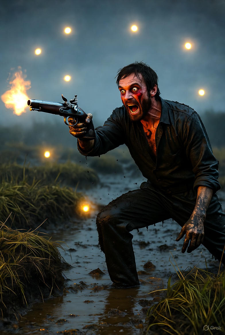 Now the man ran around all night and shot at the will-o’-the-wisps with an old pistol. With somnambulistic certainty he jumped over the widest peat ditches, crawled through the mud and densest undergrowth like a swamp animal, sometimes sank up to his neck in the marsh, worked himself out again and shot incessantly.