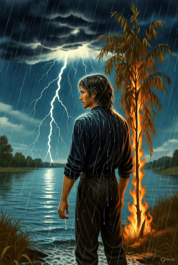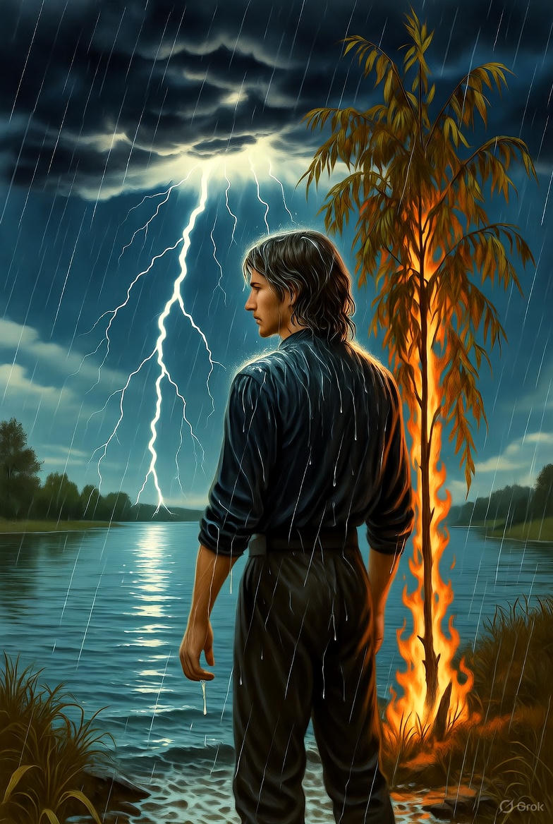 Suddenly he saw an enormous fire-garland spray from the cloud heap; he saw it split into seven lightnings and in the same moment a willow stand in flames from top to bottom. It was torn from top to bottom and fell apart.