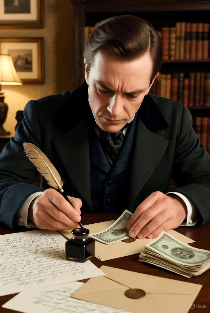 With feverish haste he wrote a long letter, put paper money in, sealed the envelope, leaned back in the chair and stared thoughtlessly ahead.