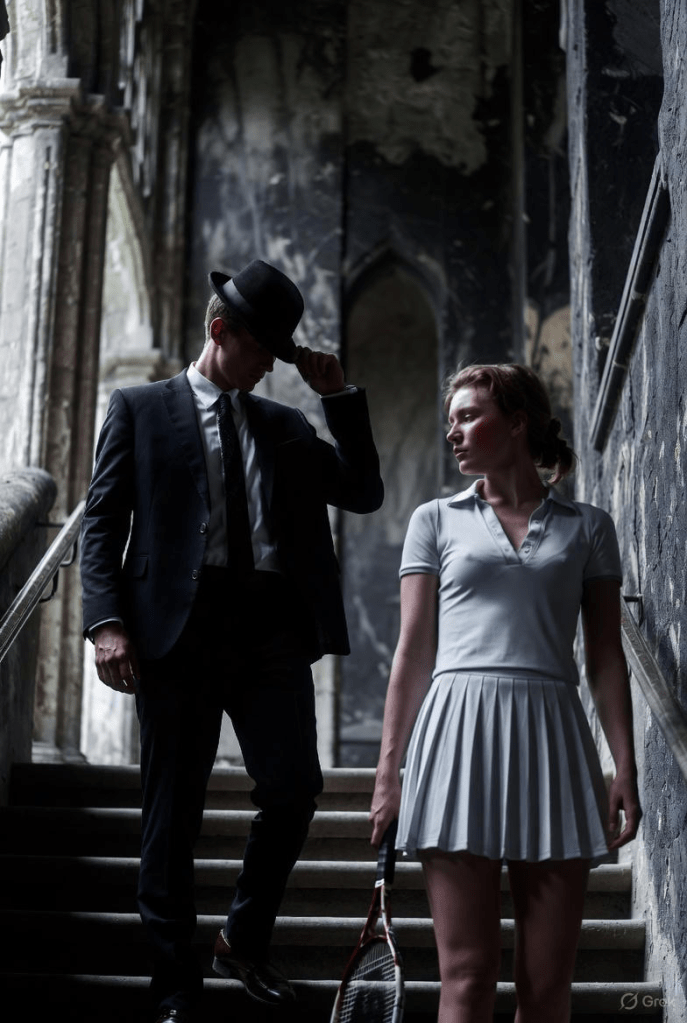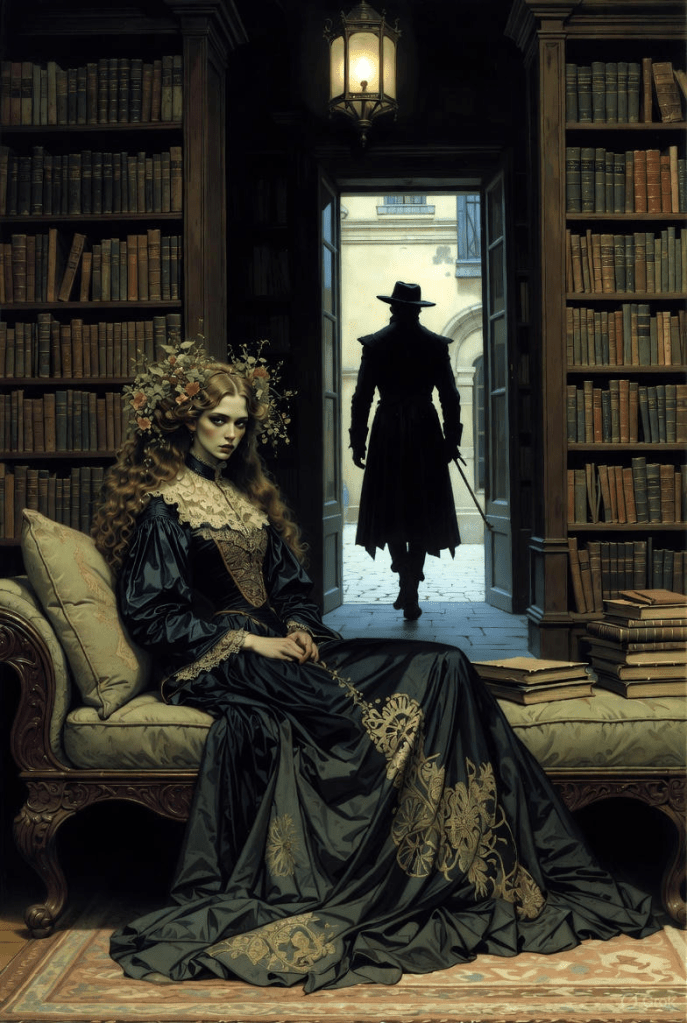 feathered hats, and swords. They sat quietly, smoking from