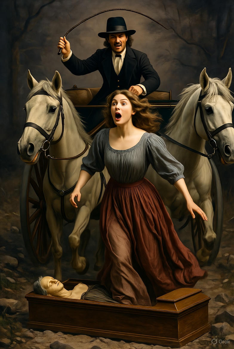 Suddenly, the horses stop, they rear, buck, and whinny like the stallions in fairy tales that suddenly get human voices. The driver whips them, but it only gets worse. He climbs down from the box, I crawl out of the carriage, we grab the horses by the reins and try to move them forward. It doesn’t work; the horses go wild, and the driver redundantly states that they won’t move. What in heaven’s name happened? It was so dark you could’ve slapped someone without being seen. Well, I gather my courage, groping cautiously along the road with hands and feet, and—believe me, I have enough personal courage to stir up the strangest scandals, but this time my heart just stopped. I tripped over a coffin and fell with my knees onto a corpse.”