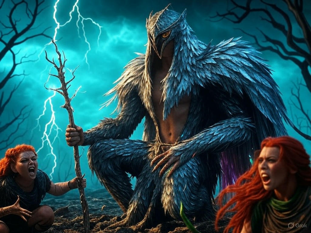 The OAK roots hum, their voice deep and jagged: “Reach’s echo cracks—west rifts.” Fiona spins—green eyes blaze—staff lifts—vines pulse along its length: “Helium’s rift—prove it!” Tobal rises—brown eyes lock—scarred fists clench—voice bites: “Call it—Eden’s wild demands.” Rafe hops down—hazel eyes flare—vest swings—grins wild: “Feathers—rift’s yours!” Becca steps up—yin roars—blue eyes flare—axe gleams—growls: “Source it—now!” Cal shifts—spear snaps up—gray eyes steady—murmurs: “Roots tear—Helium calls.” Valentine’s hackles spike—gray shadow lunges—wild coils—OAKs roar—the feathered kin stumbles through a rift, amber eyes blazing—gray feathers shimmer—OAK staff cracks—Eden’s wild surges, testing.
