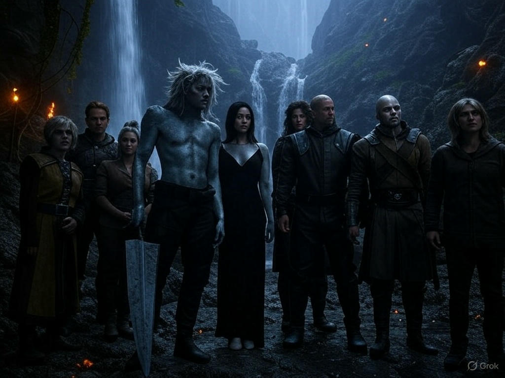 A low hum pulsed through—Radon’s cry, raw and urgent, threading through the wild—“Dark consumes—wild fades”—a sharp hiss followed, reptilian and demonic, threading through the forests as dark forces loomed. Lumens glided in, her silver luminescent skin glowing soft in a black dress, green hair flowing like vines, eyes flaring with earth’s core—shimmering wisps pulsed, threading toward the lush wild. Kael stomped beside Becca, wiry frame tense, scarred face set, tattered cloak swaying—his blade gleamed—“Evil stirs.” Becca matched him, her tunic—dark, torn—stretched taut over broad shoulders, shaved head catching the fairy glow—blue eyes flared fierce, axe sharp in her grip, yin’s wild snarling low—her breath steamed hot. Rafe darted near Mara, his tunic—coarse, patched—flapping loose, hazel eyes glinting mischief—his knife spun, steel flashing, yang’s playful spark threading his wiry frame as he nicked a vine—a grin flashed sly. Mara, lean and steady, cracked staff pulsing, stepped with him—“Magic calls.” Cal stood tall with Lila, his tunic—soft, faded—hanging loose, tangled brown hair brushing his brow—gray eyes steadied calm, spear light in his grip, yang’s quiet strength pulsing steady—his stance rooted firm. Lila, slight and quick, patched hood framing her face, darted beside—“Wild sings.” Valentine bounded in, his coat—thick, matted—bristling soft, yellow eyes glinting sharp—claws tapped moss, yang’s instinct rumbling low through his shaggy stride, nose flaring at the dark stench.